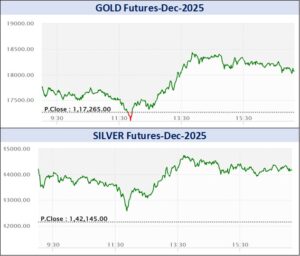 ચાંદીના વાયદાઓમાં ચાંદી ડિસેમ્બર વાયદો કિલોદીઠ રૂ.143204ના ભાવે ખૂલી, ઉપરમાં રૂ.144844ના ઓલ ટાઇમ હાઇ અને નીચામાં રૂ.142466ના મથાળે અથડાઈ, રૂ.142145ના આગલા બંધ સામે રૂ.2085 વધી રૂ.144230 થયો હતો. કિલોદીઠ ચાંદી-મિની નવેમ્બર વાયદો રૂ.1994 વધી રૂ.144380ના સ્તરે પહોંચ્યો હતો. ચાંદી-માઇક્રો નવેમ્બર વાયદો રૂ.1956 વધી રૂ.144317ના ભાવે ટ્રેડ થઈ રહ્યો હતો.