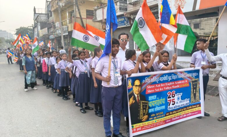 સુરત: ભારતીય બૌદ્ધ મહાસભા અને વિશ્વ શાંતિદૂત મહાબોધિ બુદ્ધ વિહાર, નીલગિરી – લિંબાયત, સુરત દ્વારા શ્રી આઈ.જી. ઇંગ્લિશ અકાદમી તથા શ્રી આઈ.જી. વિદ્યામંદિર, શાંતિનગરના સહયોગથી 75મો બંધારણ દિવસ ગૌરવ મહોત્સવ યાત્રા–2025 નો ભવ્ય કાર્યક્રમ યોજાયો હતો। આ રેલીનું નેતૃત્વ વિશ્વ શાંતિદૂત મહાબોધિ બુદ્ધ વિહારના સ્થાપક તથા અધ્યક્ષ અને દર્દી સેવા સમિતિના અધ્યક્ષ સુભાષ પી ઝાડે શ્રી દ્વારા કરવામાં આવ્યું। કાર્યક્રમમાં આર.પી.આઈ.ના રાષ્ટ્રીય મહાસચિવ શ્રી વિજય મસુરિયા, શ્રી આઈ.જી. ઇંગ્લિશ અકાદમીના પ્રિન્સિપાલ શ્રી અશોક દાશ, આમ આદમી પાર્ટીના લોકસભા પ્રભારી શ્રી પંકજ તાયડે, તેમજ આર.પી.આઈ. મહિલા પ્રમુખ સુરત શ્રીમતી સંધ્યા બહેન ભગત વિશેષ ઉપસ્થિત રહ્યા હતા। શ્રી આઈ.જી. ઇંગ્લિશ અકાદમી અને વિદ્યામંદિરના શિક્ષકગણ — જયા ગંવઈ, કલ્પના પાટીલ, રત્ના માલી, પલ્લવી કોળ્હે, અમોલ બેહેરે, વિકાસ કોસ્ટી, સની રામરાજે, સંતોષ ભગત, ભાગવત વાનખેડે, વિમલ ગંવઈ, મીના સોનવણે, દિવ્યા ખંડારે, સાબુ તાઈ ખંડારે, સંગીતા મોંધે, શિલા બહેન આઠવલે, વિમલ તાઈ અરાક, રંજના સોનવણે, ઉષાબેન સોનવણે — તેમજ મહીલા ઉપાસિકા સંગ અને ઉપાસક સંગના સભ્યોએ સક્રિય ભાગ લઈ કાર્યક્રમને સફળ બનાવ્યો હતો। રેલી દરમિયાન બાબાસાહેબ ડૉ. બી.આર. આંબેડકરના વિચારોનું સ્મરણ, બંધારણ પ્રત્યે જાગૃતિ, તેમજ “બંધારણ બચાવો – લોકશાહી બચાવો” જેવા નારા સાથે સમાજમાં જાગૃતિનો સંદેશ ફેલાવવામાં આવ્યો હતો। આ ગૌરવ મહોત્સવ યાત્રાએ સમાજમાં બંધારણની મહત્તા, સમાનતા, ન્યાય અને લોકશાહી મૂલ્યો પ્રત્યે નવી ઉર્જા અને સંકલ્પ જાગૃત કર્યો।