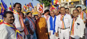 સુરત , ભારતીય બૌદ્ધ મહા સભા,વિશ્ર્વ શાંતિદુત મહાબોઘી બુદ્ધ વિહાર શાંતિનગર નીલગીરી આયોજીત વર્ષાવાસ સમાપન સમારોહ, 69 મો ધમ્મચક પ્રવર્તન મહોત્સવ ઉજવણી નાભાગરુપે તારીખ 14/10/2025 મંગળવાર બપોરે 3/00 કલાકે છત્રપતિ શિવાજી મહારાજ ની પ્રતિમા ને ફૂલહાર કરી ધમ્મ યાત્રા કાઢવામાં આવી હતી આ યાત્રા માં શૈકડો ઉપાસિકા ઉપાસક અને આગેવાનો જોડાયા હતા, છત્રપતિ શિવાજી સર્કલ થીં વિશ્વ શાંતિદૂત મહાબોધી બુદ્ધ વિહાર સુધી યાત્રા પહુચ્યા પછી સાંજે ધમ્મ વંદના, બુદ્ધ વંદના, ત્રિશરણ પંચશીલ,સંઘ વંદના,ચીવરદાન આદી ધમ્મ રક્ષિત મહાથેરો ની ઉપસ્થિતિ માં લઇ કાર્યક્રમ ની શરૂઆત કરવામાં આવી હતી,આ પ્રબોધન કાર્યક્રમ રીપ્બલીકન પાટી ઑફ ઈન્ડીયા રાષ્ટ્રીય મહાસચિવ માનવબંઘુ વિજયભાઈ મૈસુરીયના અધ્યક્ષપદે ઓજવામા આવ્યો હતો,,તેમજ મુખ્ય મહેમાનપદે ધમ્મ સેવક,ગ્રંથ વાચક ભાસ્કર વાનખડે, રીપ્બલીકન પાર્ટી ઓફ ઈન્ડીયા ગુજરાત પ્રદેશ અધ્યક્ષ દિલીપ કે સીરસાઠ, ગુજરાત પ્રદેશ મહીલા અધ્યક્ષ આશાબેન મંગળે, ગોવિંદ પિમ્પલિસકર, રાજેશ સુર્યવંશી, એડવોકેટ એલ,એસ,સિરસાઠ તથા સમાજ અગ્રણી ઉપસ્થિત રહ્યા હતા, કાર્યક્રમ સફળ બનાવવા માટે વિશેષ સહયોગ કરુણા મંડપ ના સંચાલક ચેતન બેડસે, તથાગત ગ્રુપ ના મનોજ સસાને, કૈલાસ ઠાકરે, સુનિલ આહીરે, મુકેશ પિપળે, અને ઉપાસક સંઘ અને ઉપાસિકા સંઘ એ તન મન ધન થીં સેવા કરી હતી, અત્રે ઉલ્લેખનીય છે કે આ પ્રબોધન કાર્યક્રમ માં માનવ બંધુ વિજય ભાઈ મૈસુરિયા, તથા ધમ્મ સેવક ગ્રંથ વાચક ભાસ્કર વાનખેડે નેં સમાજ ભુષણ અને સમાજ ધમ્મ રત્ન પુરસ્કાર આપવામાં આવ્યો હતો, કાર્યક્રમ ની રુપરેખા ની સમજણ સમિતિના વિહાર નાં ઉપાધ્યક્ષ શ્રી કૃષ્ણ વાનખેડે, સંજય પવાર,રવી વાનખેડે,રાજ ઇગંળે,ભાઉરાવ ઢીવરે, ગૌતમ નગરાળે, વિષ્ણુ જગદેવ, અને અન્ય યુવાનોએ આપી હતી, કાર્યક્રમ નાં અંત માં ઉપસ્થિત મહાનુભાવો અને ઉપાસક ઉપાસિકા સંઘ ની સાથે તમાંમ ઉપસ્થિત સદસ્યો નેં કાર્યક્રમ સફળ બનાવવા માટે વિશ્વ શાંતિદૂત મહાબોધી બુદ્ધ વિહાર નાં સંસ્થાપક અધ્યક્ષ તથા દર્દી સેવા સમિતિ નાં અધ્યક્ષ સુભાષ પી ઝાડે એ આભાર વ્યક્ત કર્યો હતો,