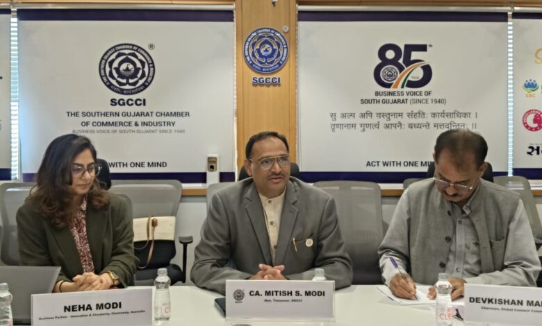 સુરતઃ ધી સધર્ન ગુજરાત ચેમ્બર ઓફ કોમર્સ એન્ડ ઈન્ડસ્ટ્રી દ્વારા મંગળવારે, તા. ૨૩ સપ્ટેમ્બર ૨૦૨૫ના રોજ સાંજે ૦૫:૦૦ કલાકે, સંહતિ, સરસાણા, સુરત ખાતે ‘Australia-India Circular Synergies: Transforming Waste into Opportunities’ વિશે સેશન યોજાયું હતું, જેમાં ઓસ્ટ્રેલિયાના ક્લીનઅવે કંપનીના ઈનોવેશન અને સર્ક્યુલારિટીના બિઝનેસ પાર્ટનર મિસ. નેહા મોદીએ સુરતના ઉદ્યોગ સાહસિકોને વેસ્ટ મેનેજમેન્ટ અને સસ્ટેનsબિલીટી વિશે માહિતી આપી હતી.