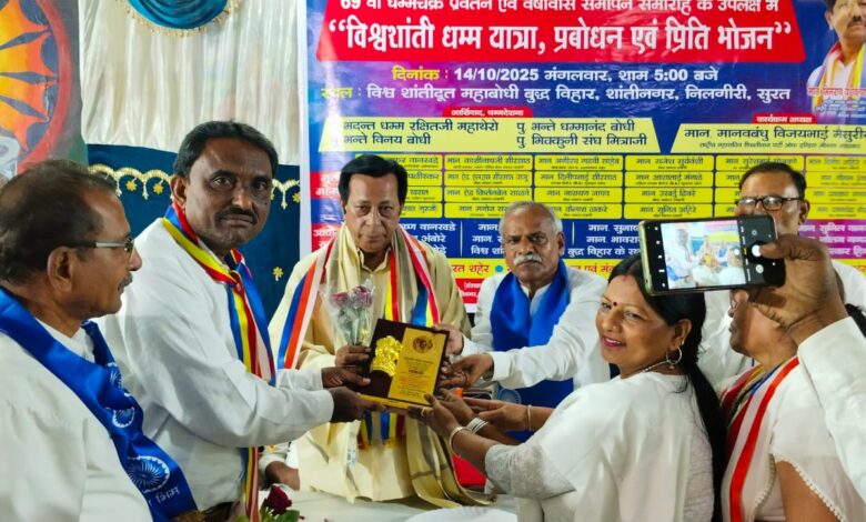 સુરત , ભારતીય બૌદ્ધ મહા સભા,વિશ્ર્વ શાંતિદુત મહાબોઘી બુદ્ધ વિહાર શાંતિનગર નીલગીરી આયોજીત વર્ષાવાસ સમાપન સમારોહ, 69 મો ધમ્મચક પ્રવર્તન મહોત્સવ ઉજવણી નાભાગરુપે તારીખ 14/10/2025 મંગળવાર બપોરે 3/00 કલાકે છત્રપતિ શિવાજી મહારાજ ની પ્રતિમા ને ફૂલહાર કરી ધમ્મ યાત્રા કાઢવામાં આવી હતી આ યાત્રા માં શૈકડો ઉપાસિકા ઉપાસક અને આગેવાનો જોડાયા હતા, છત્રપતિ શિવાજી સર્કલ થીં વિશ્વ શાંતિદૂત મહાબોધી બુદ્ધ વિહાર સુધી યાત્રા પહુચ્યા પછી સાંજે ધમ્મ વંદના, બુદ્ધ વંદના, ત્રિશરણ પંચશીલ,સંઘ વંદના,ચીવરદાન આદી ધમ્મ રક્ષિત મહાથેરો ની ઉપસ્થિતિ માં લઇ કાર્યક્રમ ની શરૂઆત કરવામાં આવી હતી,આ પ્રબોધન કાર્યક્રમ રીપ્બલીકન પાટી ઑફ ઈન્ડીયા રાષ્ટ્રીય મહાસચિવ માનવબંઘુ વિજયભાઈ મૈસુરીયના અધ્યક્ષપદે ઓજવામા આવ્યો હતો,,તેમજ મુખ્ય મહેમાનપદે ધમ્મ સેવક,ગ્રંથ વાચક ભાસ્કર વાનખડે, રીપ્બલીકન પાર્ટી ઓફ ઈન્ડીયા ગુજરાત પ્રદેશ અધ્યક્ષ દિલીપ કે સીરસાઠ, ગુજરાત પ્રદેશ મહીલા અધ્યક્ષ આશાબેન મંગળે, ગોવિંદ પિમ્પલિસકર, રાજેશ સુર્યવંશી, એડવોકેટ એલ,એસ,સિરસાઠ તથા સમાજ અગ્રણી ઉપસ્થિત રહ્યા હતા, કાર્યક્રમ સફળ બનાવવા માટે વિશેષ સહયોગ કરુણા મંડપ ના સંચાલક ચેતન બેડસે, તથાગત ગ્રુપ ના મનોજ સસાને, કૈલાસ ઠાકરે, સુનિલ આહીરે, મુકેશ પિપળે, અને ઉપાસક સંઘ અને ઉપાસિકા સંઘ એ તન મન ધન થીં સેવા કરી હતી, અત્રે ઉલ્લેખનીય છે કે આ પ્રબોધન કાર્યક્રમ માં માનવ બંધુ વિજય ભાઈ મૈસુરિયા, તથા ધમ્મ સેવક ગ્રંથ વાચક ભાસ્કર વાનખેડે નેં સમાજ ભુષણ અને સમાજ ધમ્મ રત્ન પુરસ્કાર આપવામાં આવ્યો હતો, કાર્યક્રમ ની રુપરેખા ની સમજણ સમિતિના વિહાર નાં ઉપાધ્યક્ષ શ્રી કૃષ્ણ વાનખેડે, સંજય પવાર,રવી વાનખેડે,રાજ ઇગંળે,ભાઉરાવ ઢીવરે, ગૌતમ નગરાળે, વિષ્ણુ જગદેવ, અને અન્ય યુવાનોએ આપી હતી, કાર્યક્રમ નાં અંત માં ઉપસ્થિત મહાનુભાવો અને ઉપાસક ઉપાસિકા સંઘ ની સાથે તમાંમ ઉપસ્થિત સદસ્યો નેં કાર્યક્રમ સફળ બનાવવા માટે વિશ્વ શાંતિદૂત મહાબોધી બુદ્ધ વિહાર નાં સંસ્થાપક અધ્યક્ષ તથા દર્દી સેવા સમિતિ નાં અધ્યક્ષ સુભાષ પી ઝાડે એ આભાર વ્યક્ત કર્યો હતો,