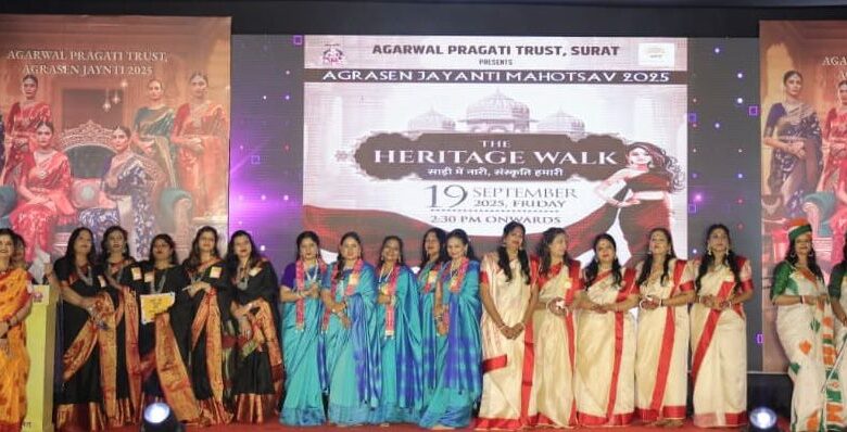 મહારાજા અગ્રસેન જયંતિ નિમિત્તે, અગ્રવાલ પ્રગતિ ટ્રસ્ટ મહિલા શાખા દ્વારા શુક્રવારે ડુમસમાં અગ્ર-એક્ઝોટિકાના ઇમ્પીરીયલ હોલ ખાતે “ધ હેરિટેજ વોક” ફેશન શોનું આયોજન કરવામાં આવ્યું હતું, જેનો થીમ “સાડીઓમાં મહિલાઓ – આપણી સંસ્કૃતિ” હતી.